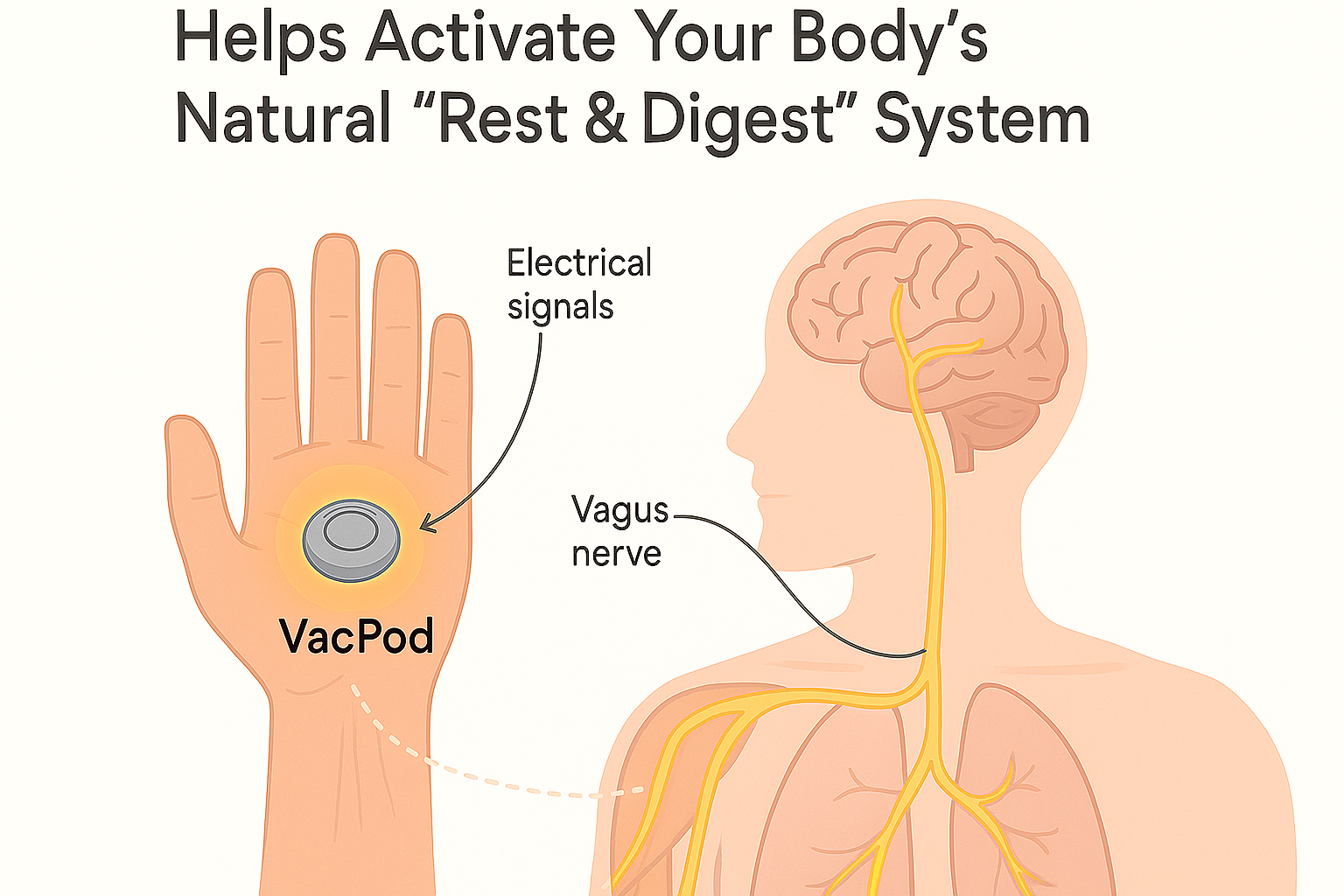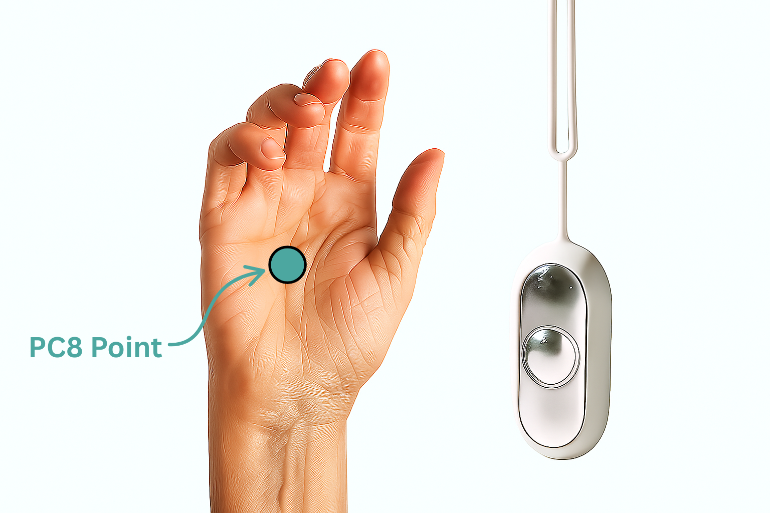 Positioning – For best results, place your VacPod on the PC8 acupressure point or the TW3/TW2 meridian points. (See image above)